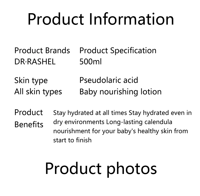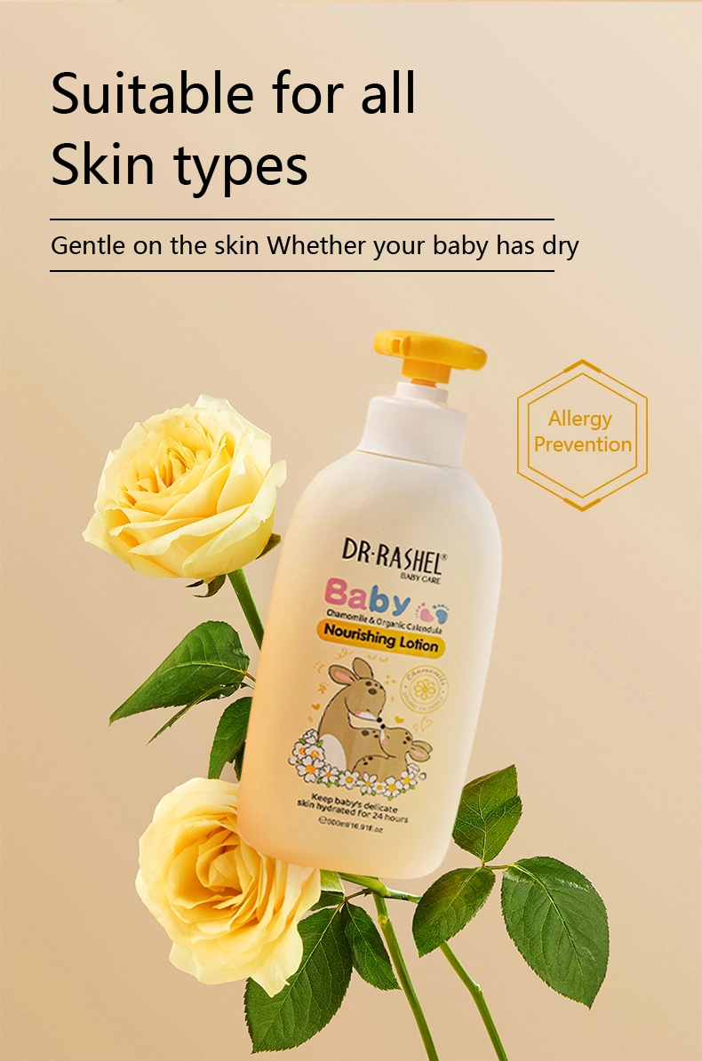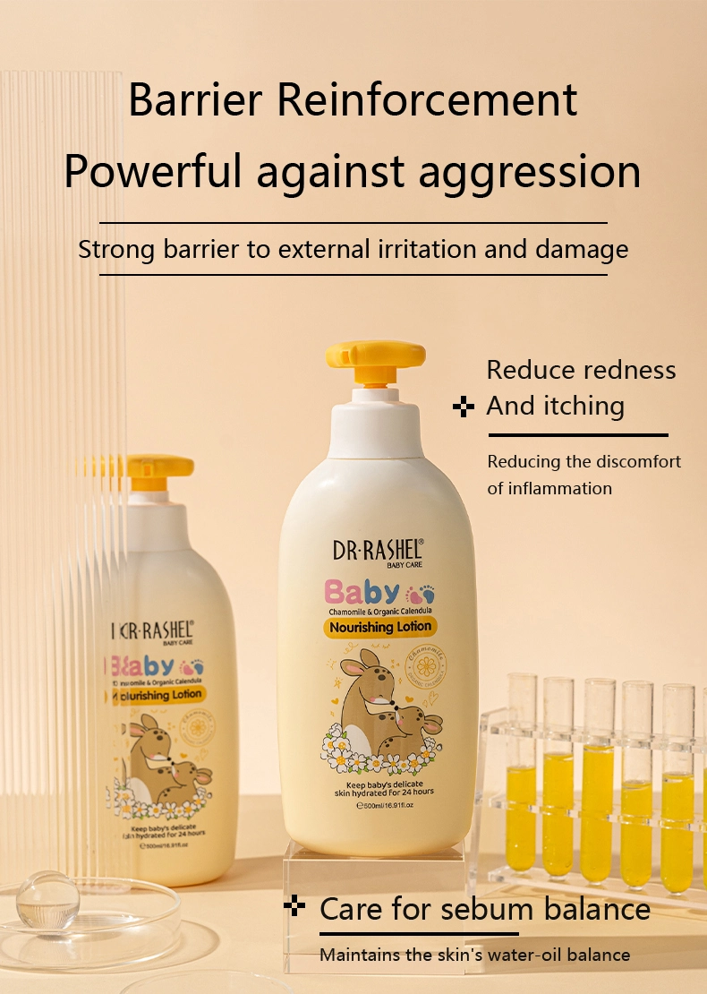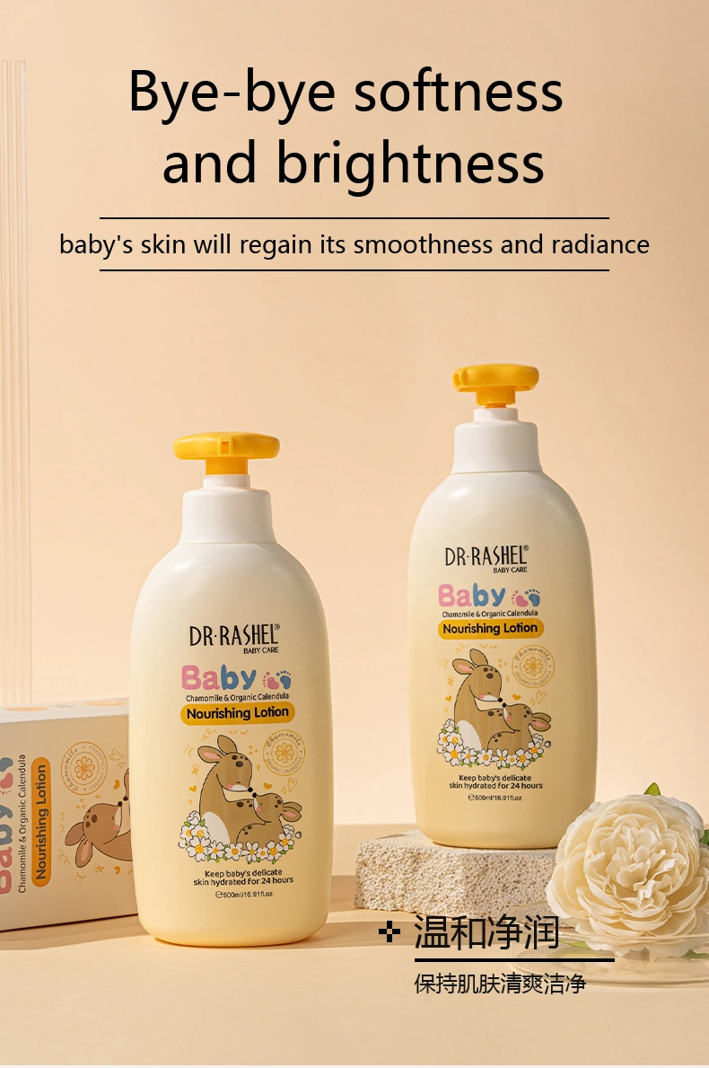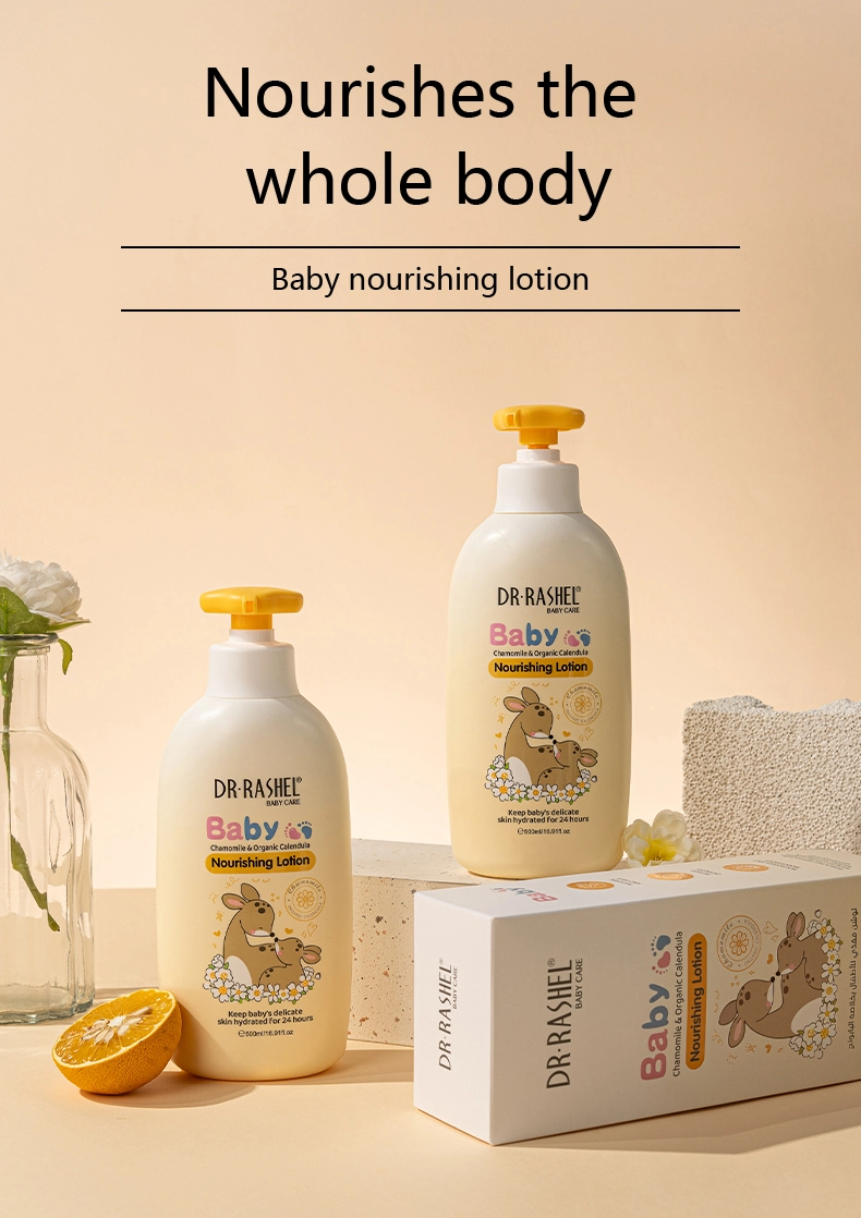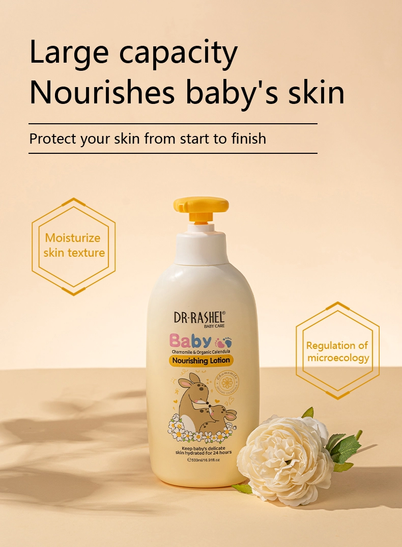 Dr. Rashel Baby nourishing lotion-500ml is designed to soothe and nourish, while moisturizing and protecting your baby’s skin from dryness. Formulated with organic calendula to soothe plus sweet almond oil and Vitamin E to soften and smooth skin. Protects from redness & rashes, arising out of dry skin conditions,nourishes from inside giving soft and smooth skin