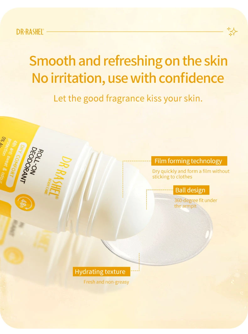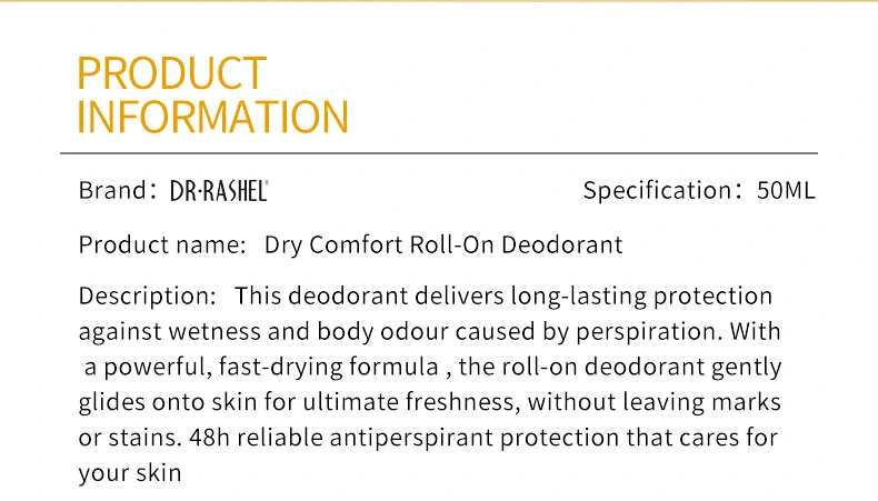 Dr. Rashel This deodorant delivers long-lasting protection against wetness and body odour caused by perspiration. With a powerful, fast-drying formula , the roll-on deodorant gently glides onto skin for ultimate freshness, without leaving marks or stains. 48h reliable antiperspirant protection that cares for your skin.