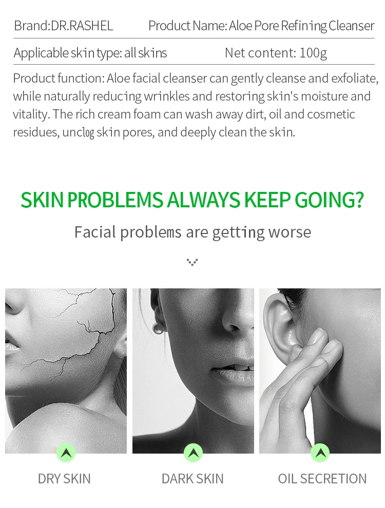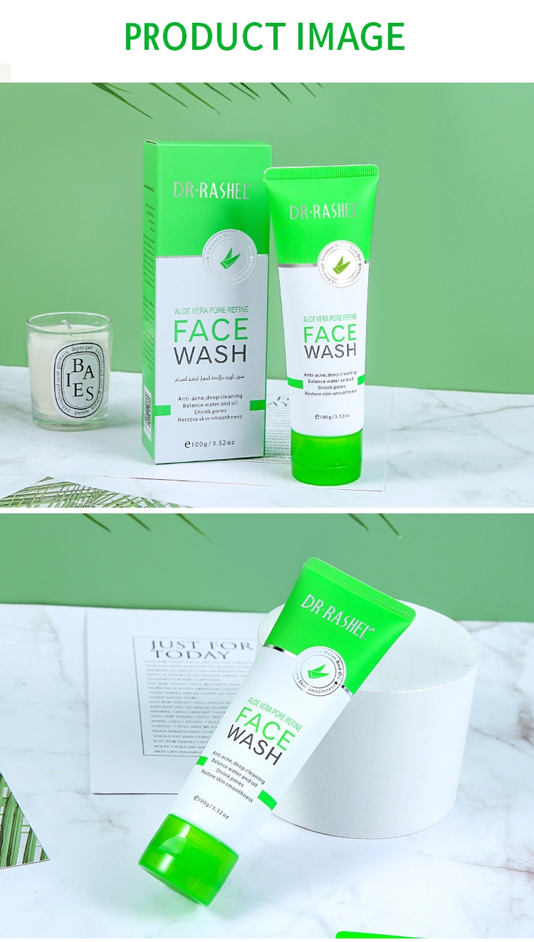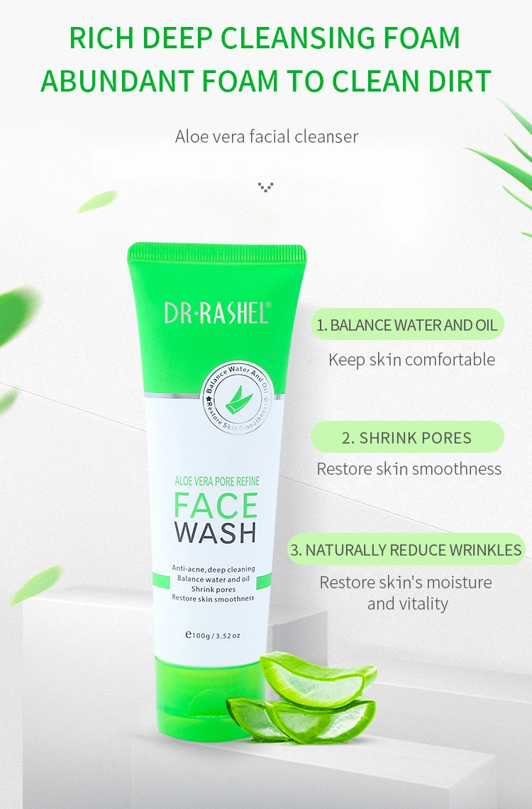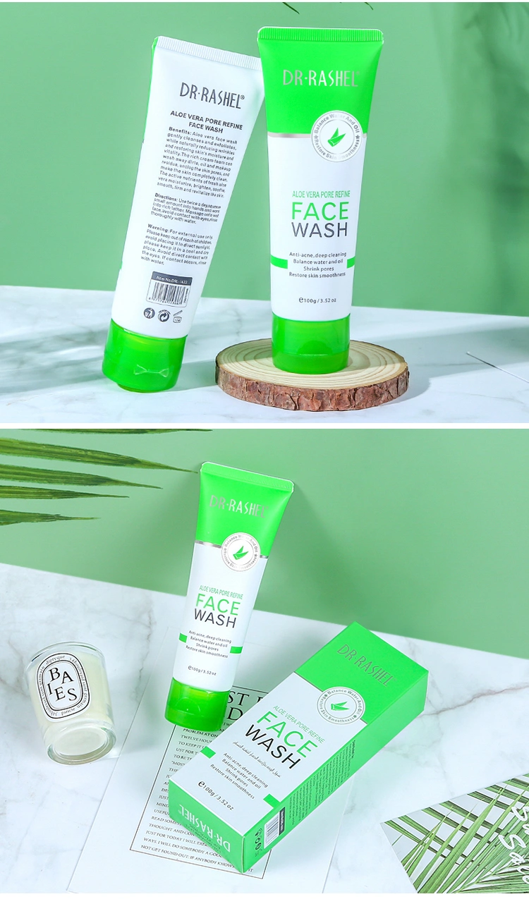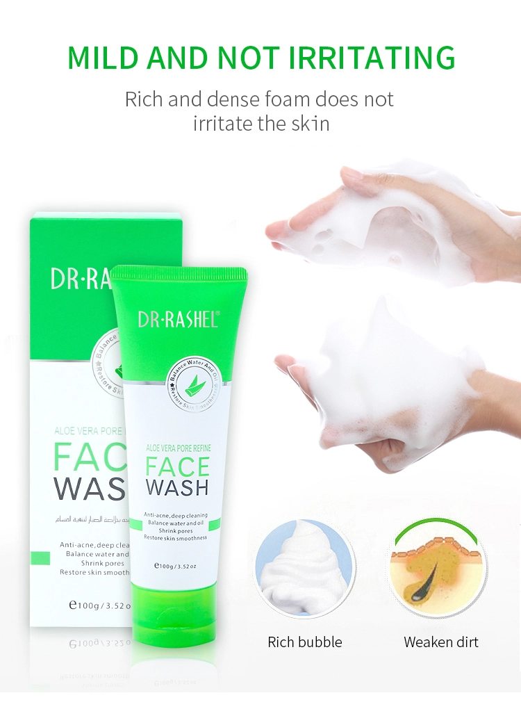 Dr. Rashel Aloe vera pore refine face wash gently cleanses and exfoliates, while naturally reducing wrinkles and restoring skin’s moisture and vitality.The rich cream foam can wash away dirte, oil and makeup residue, unclog the skin pores, and make the skin completely clean. The active nutrients of fresh aloe vera moisturize, brighten, soothe, smooth, firm and revitalize the skin.
