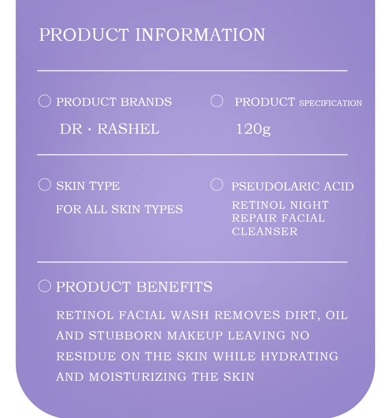 Dr. Rashel Retinol facial cleanser lathers away dirt, oil and stubborn make-up, leaving skin without any residue, while moisturize skin with a boost of vital hydration;Clean face with the added skin renewing benefits of retinol. skin is refreshingly clean and touchable supple every time you cleanse.