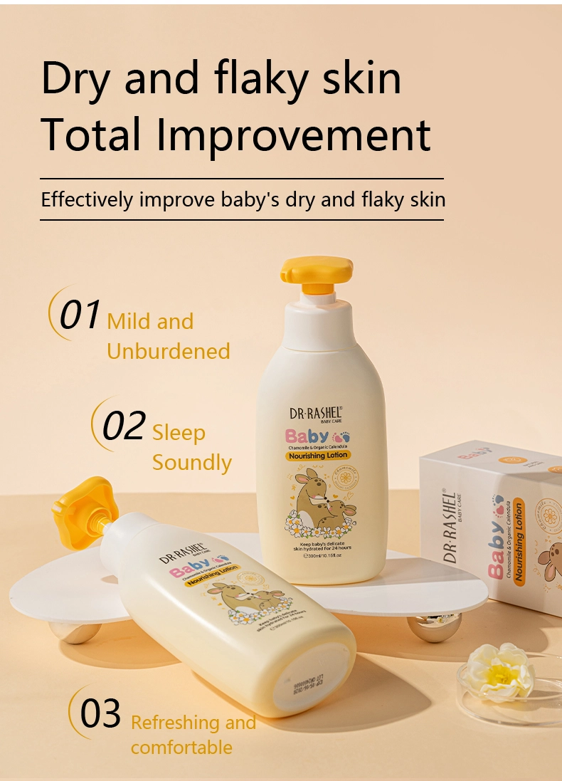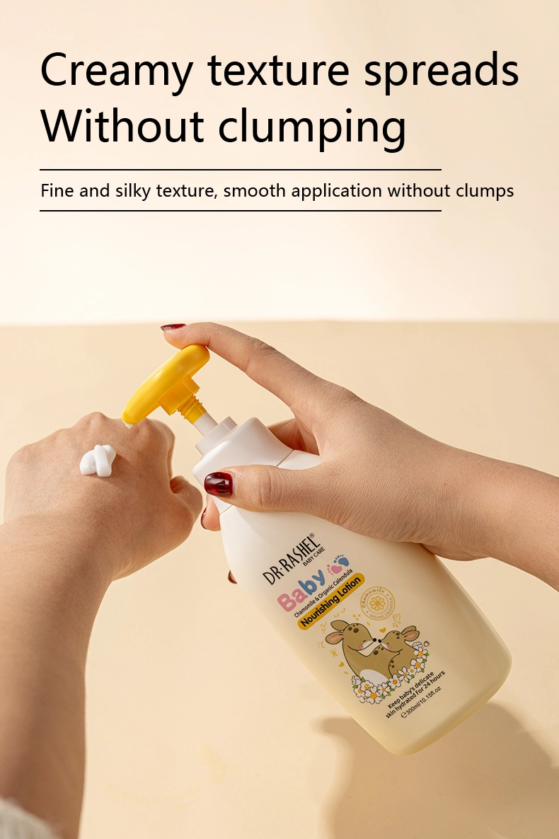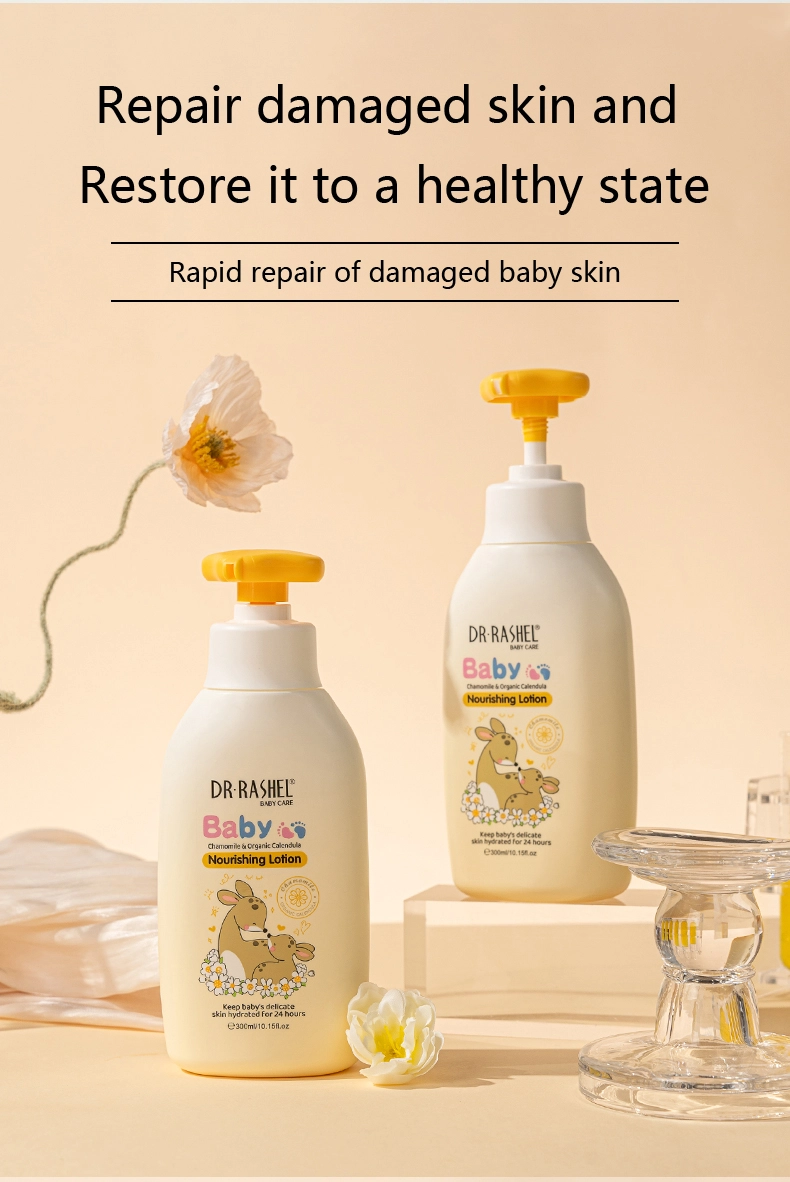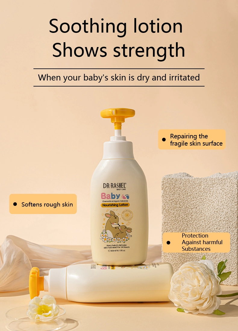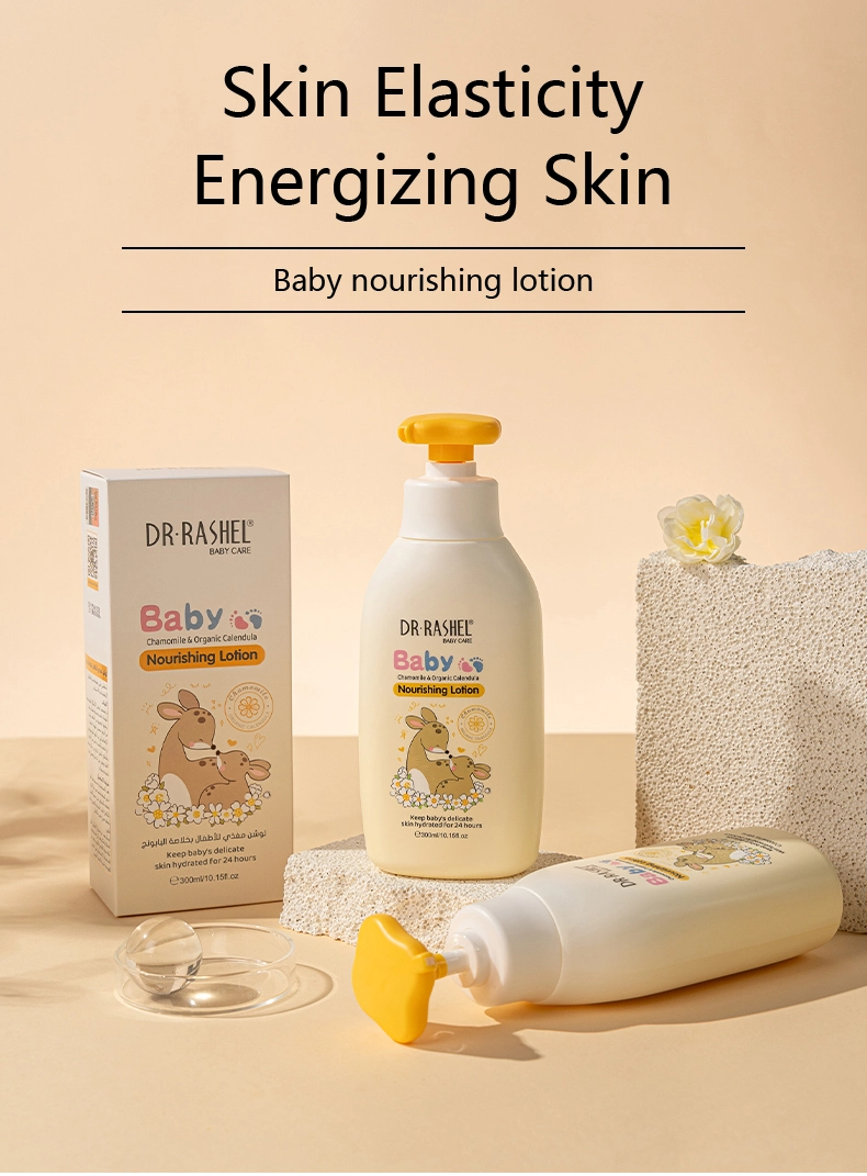 Dr. Rashel Baby nourishing lotion-300ml is designed to soothe and nourish, while moisturizing and protecting your baby’s skin from dryness. Formulated with organic calendula to soothe plus sweet almond oil and Vitamin E to soften and smooth skin. Protects from redness & rashes, arising out of dry skin conditions,nourishes from inside giving soft and smooth skin