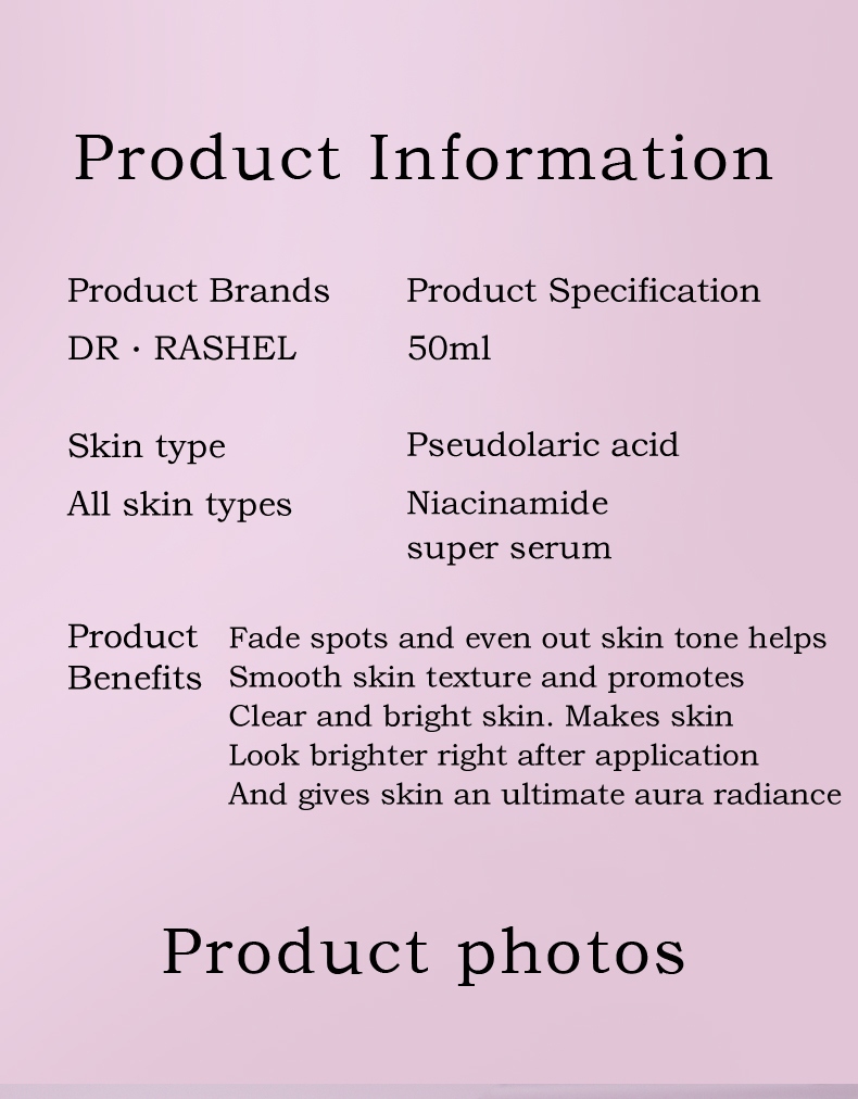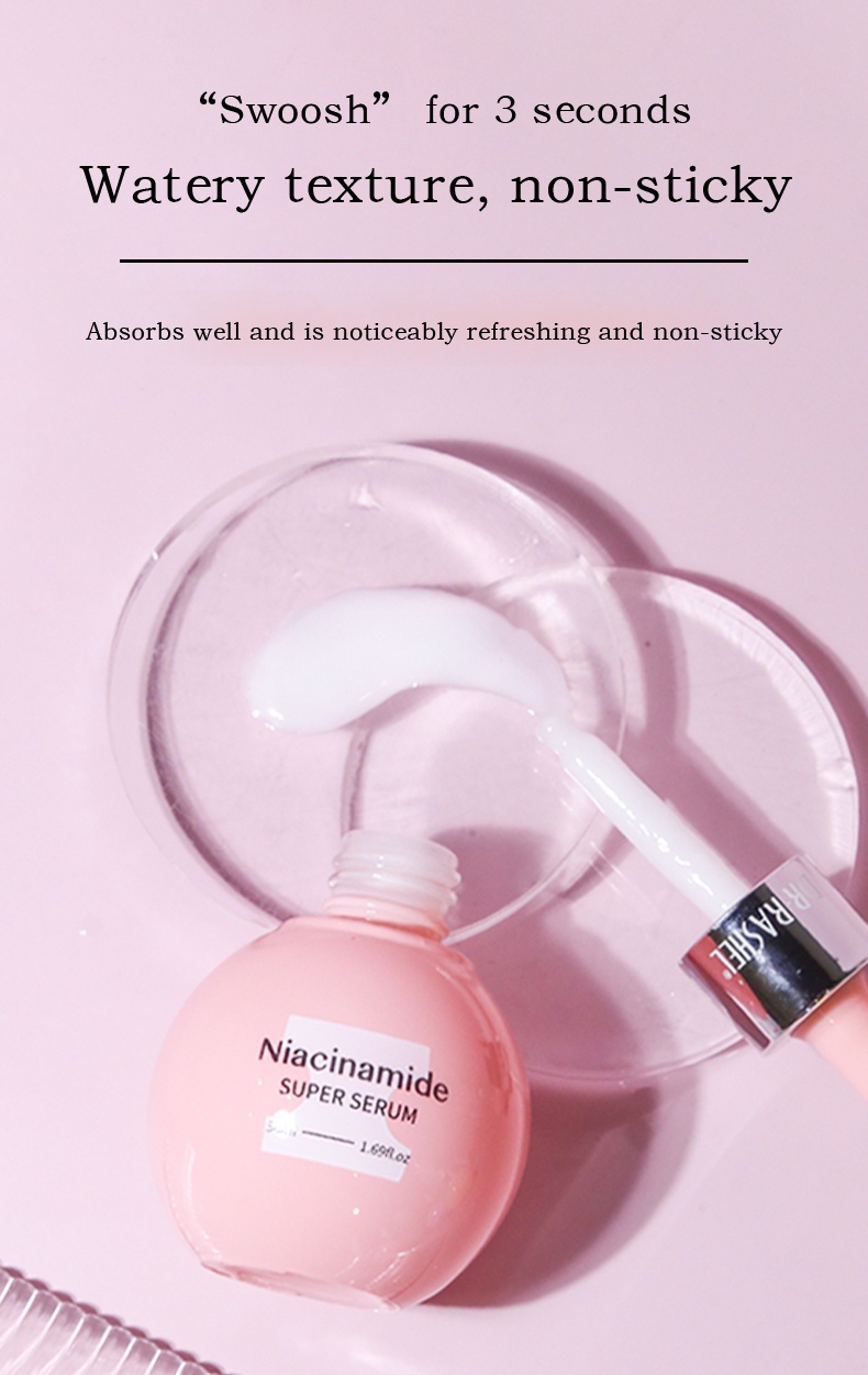Niacinamide super serum is a product designed to improve the clarity and shine of the skin. It can effectively reduce blemishes, fade spots and even out skin tone,helps smooth skin texture and promotes clear and bright skin. Makes skin look brighter right after application and gives skin an ultimate aura radiance.
