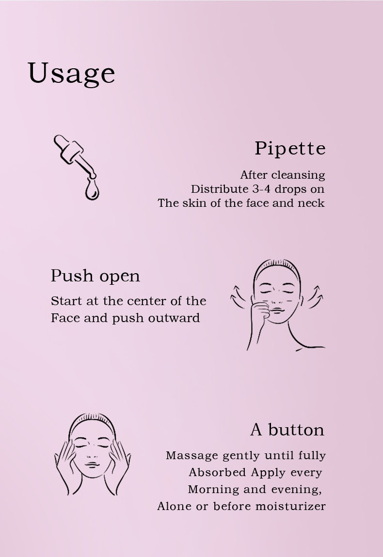 Used on cleansed skin, distribute 3-4 drops on the skin of the face and neck, starting from the center of the face and working your way out, and massage gently until fully absorbed, used every morning and evening,alone or before your moisturizer.
