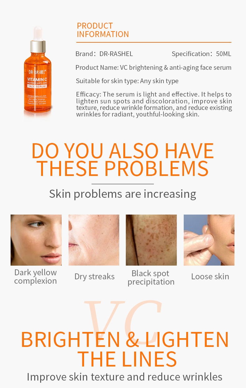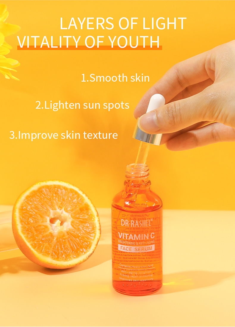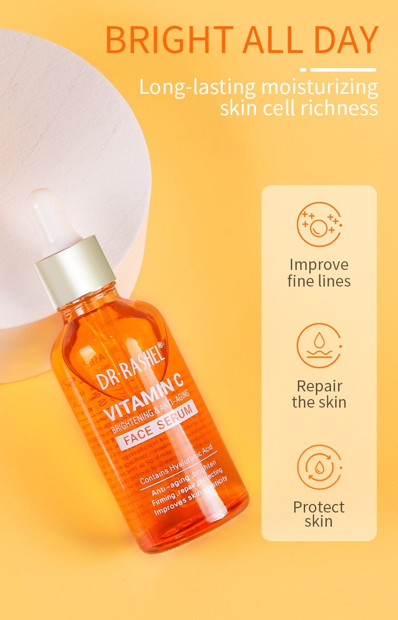 With our new improved formula, DR·RASHEL Vitamin C face Serum is thin and highly effective. It will help fade sun spots & discoloration, refine skin texture, reduce wrinkle formation, and minimize existing wrinkles. It also has a high concentrated base of pure vegan hyaluronic acid to plump skin cells and protect and restore. Brightens and smoothes skin for a more radiant and youthful complexion. Powerful antioxidants neutralize free radicals to prevent and reverse sun damage and fade sun spots and discoloration.