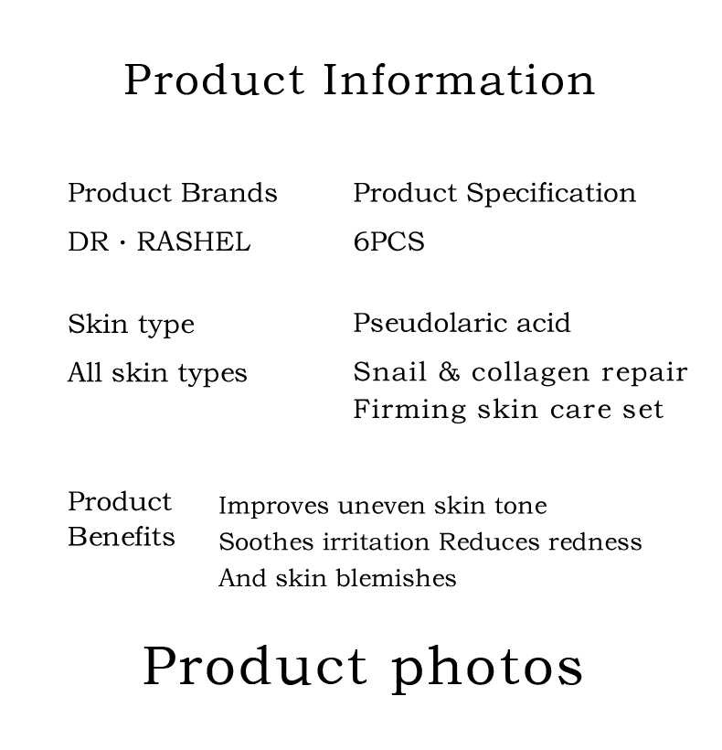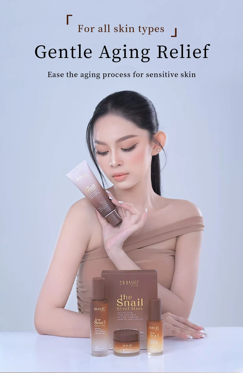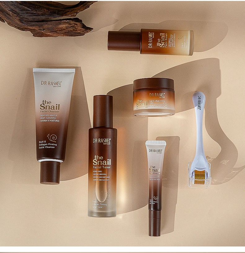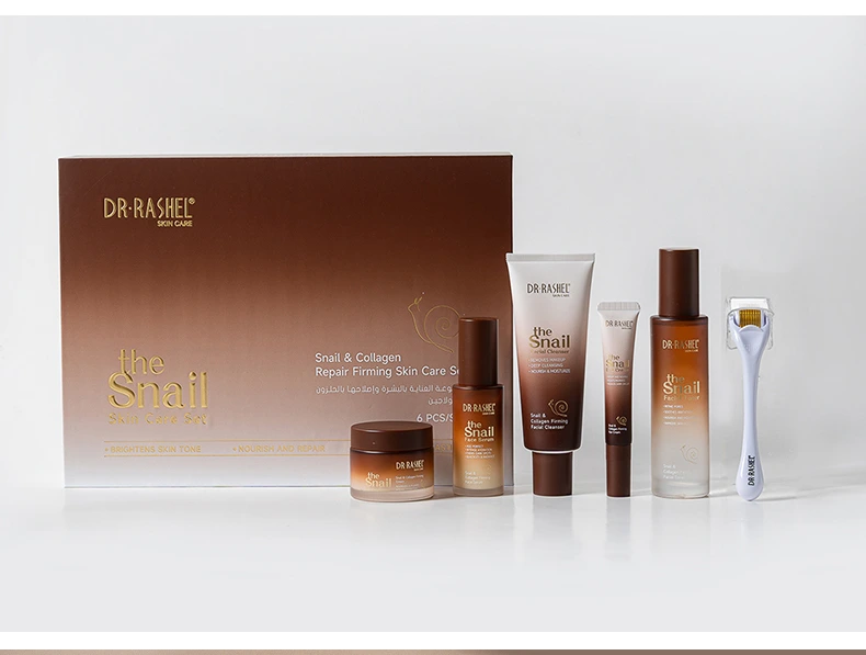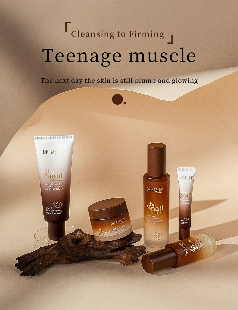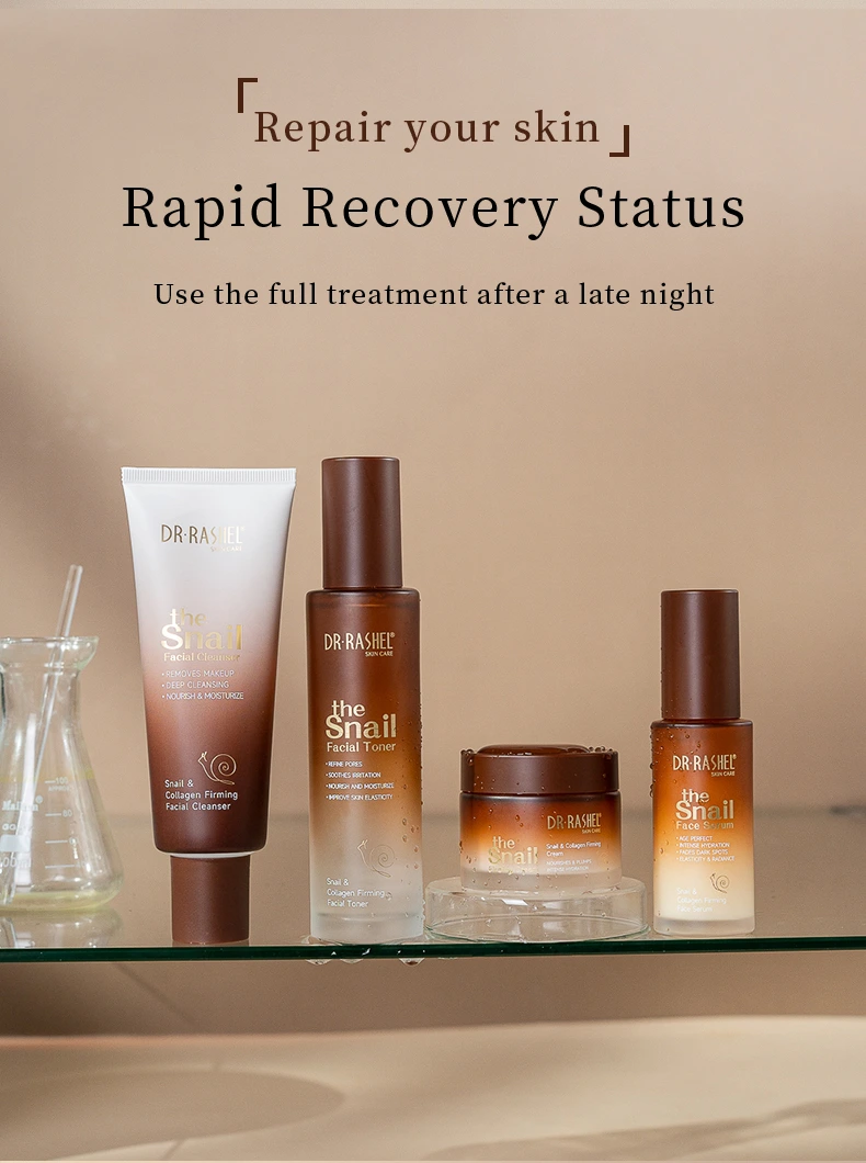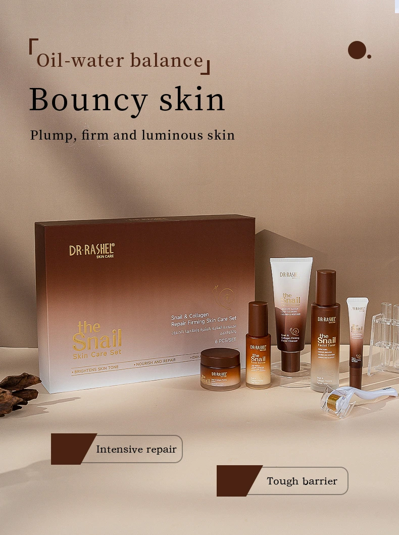 This complete snail and collagen skincare set helps repair damaged skin, strengthen the skin barrier, and deeply hydrate and nourish the skin. It improves skin elasticity and firmness, smooths the appearance of fine lines and wrinkles, and enhances overall skin texture and radiance. With continued use, it helps brighten dull and uneven skin tone, soothe irritation and redness, and reduce the appearance of dark spots and acne scars, leaving the skin soft, supple, youthful, and healthy-looking.