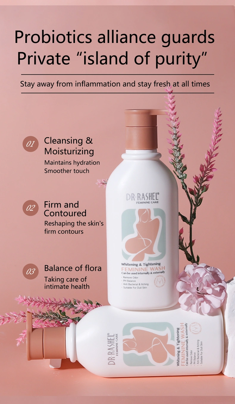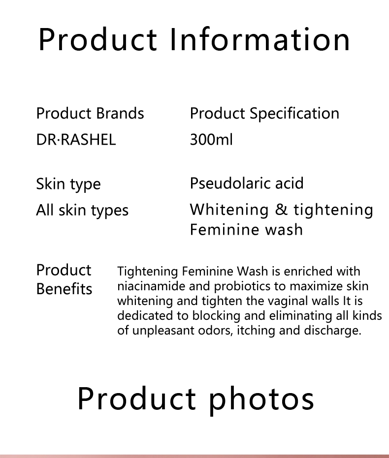 Dr. Rashel Whitening & tightening Feminine wash Enriched with niacinamide and probiotics, this whitening and firming feminine wash works to maximize skin whitening and tighten vaginal walls. It works towards blocking out and eradicating all kinds of unpleasant odors, itchiness and discharge,keeping the vaginal area refreshes, soothes, deodorizes and keeps the intimate area protected and comfortable throughout the day. Suitable for daily use.