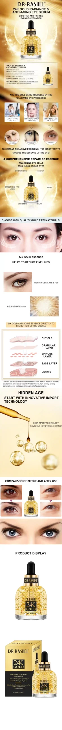 Dr. Rashel 24K Gold radiance & anti-aging eye serum helps to reduce the appearance of fine lines, wrinkles, crow’s feet and puffiness, while leaving skin under and around eyes looking firmer for a soft youthful glow. It infused with Collagen to fight the appearance of premature aging signs, natural oils and Hyaluronic  Acid to offer deep hydration and nourishment.