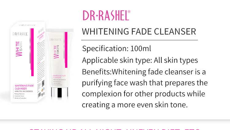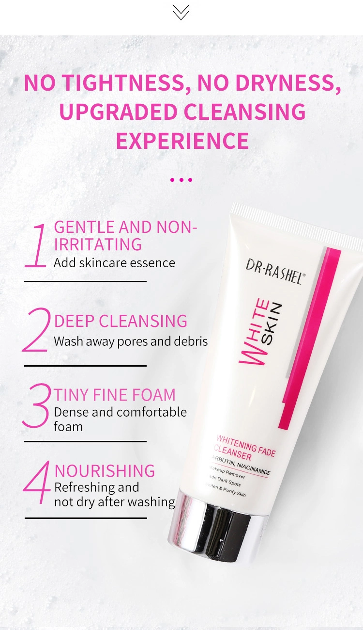 Dr. Rashel Whitening fade cleanser is a purifying face wash that prepares the complexion for other products while creating a more even skin tone. The creamy formula removes makeup, oil, dirt and debris from pores to promote healthy skin. Contains arbutin and niacinamide ingredients in this cream cleanser also gently exfoliate and encourage cell turnover to fade dark spots and discoloration.