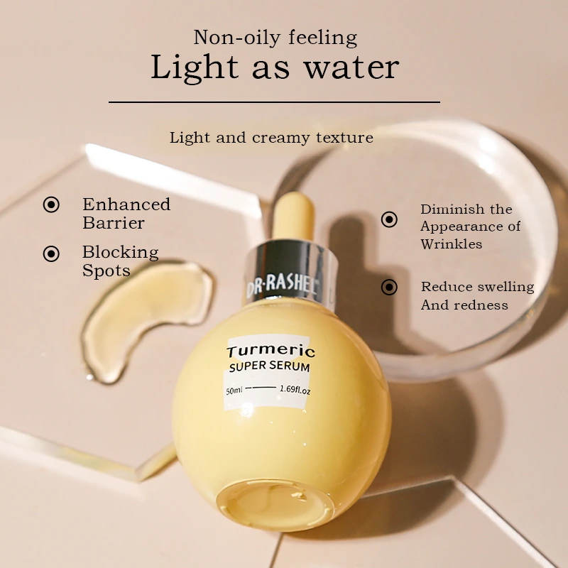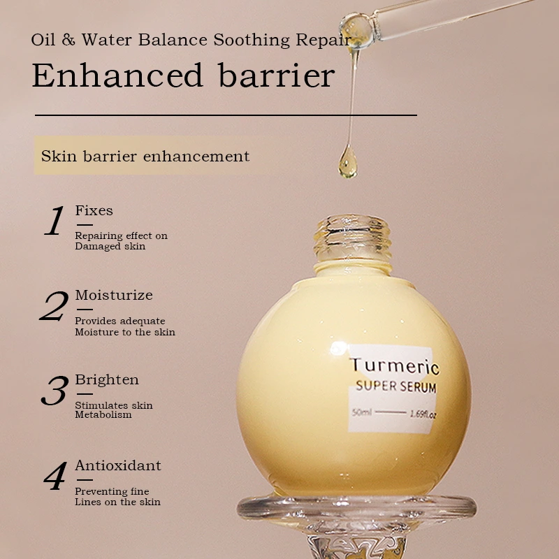 El nostre super sorum de cúrcuma combina els potents beneficis de l'extracte de curcuma longa, conegut per les seves riques propietats antioxidants i antiinflamatòries. L'extracte de Curcuma longa ajuda a protegir la pell dels estrès ambientals, reduint l'aparició d'arrugues i línies fines, al mateix temps que promou una pell més jove i radiant.