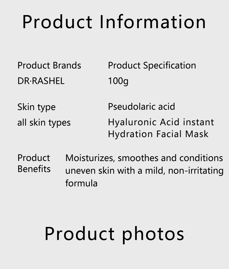 Dr. Rashel Hyaluronic acid instant hydration facial mask Pamper your skin with this hydrating, smoothing hyaluronic acid based mask for brighter, refined, younger-looking skin. Our hyaluronic acid facial mask is specially formulated for your face, which can moisturize, smooth and regulate uneven skin. Its formula is gentle and non irritating, which can reduce wrinkles and fine lines. The hydration station for seriously thirsty skin.