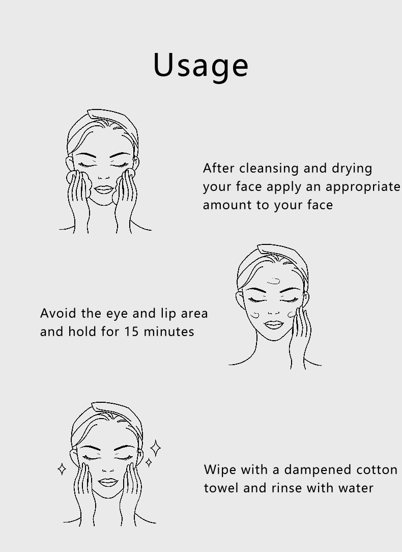 After cleansing, dry the face, apply an appropriate amount on the face, avoiding the eye and lip areas, keep it for 15 minutes, wipe it with a damp cotton towel, and then rinse with water.