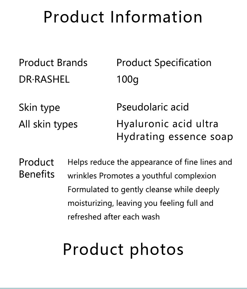 Dr. Rashel Hyaluronic Acid Ultra Hydrating Essence soap Experience the perfect blend of hydration and cleansing with our hyaluronic acid hydrating soap. Hyaluronic acid helps reduce the appearance of fine lines, promoting a youthful complexion. Formulated to gently cleanse while deeply moisturizing, ensuring your skin feels plump and rejuvenated after every wash.