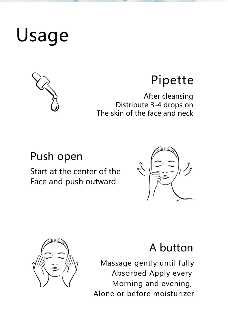 Used on cleansed skin, distribute 3-4 drops on the skin of the face and neck, starting from the center of the face and working your way out, and massage gently until fully absorbed, used every morning and evening, alone or before your moisturizer.