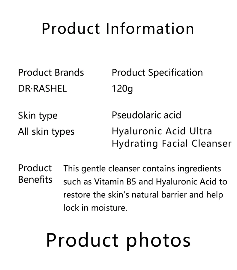 Dr. Rashel Hyaluronic Acid Ultra Hydrating Facial Cleanser removes dirt and oil and effectively dissolves waterproof makeup and sunscreen,leaving your face clean and soft.This gentle facial cleanser with ingredients like vitamin B5 and hyaluronic acid that work to restore the skin’s natural barrier to help the skin lock in moisture,skin looks fresh, hydrated, plump and youthfully radiant.