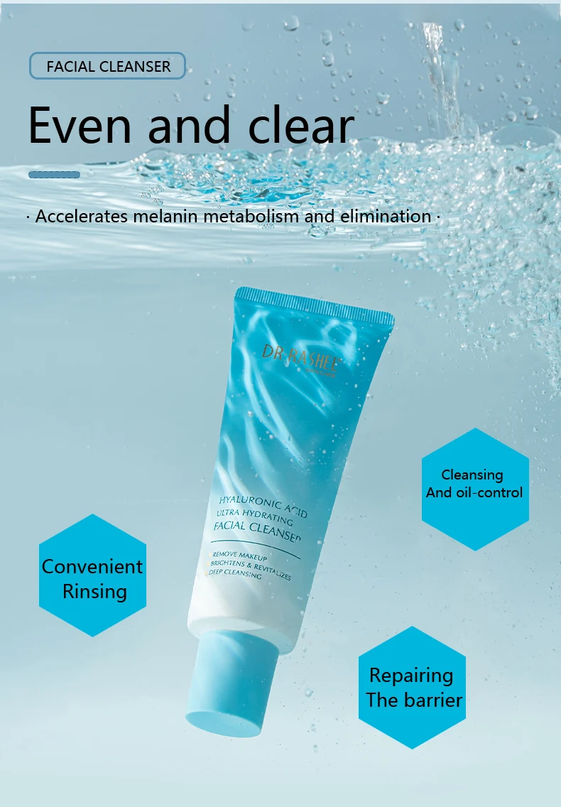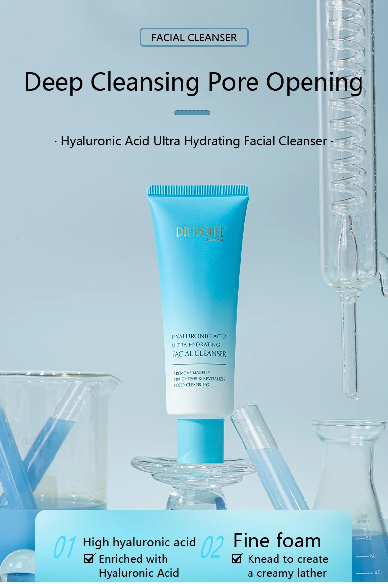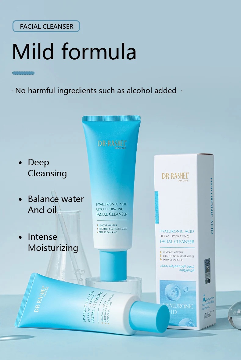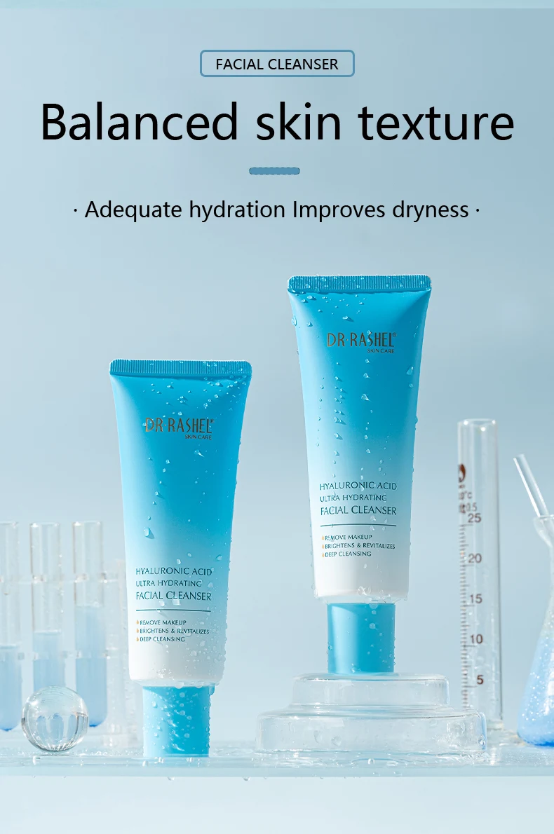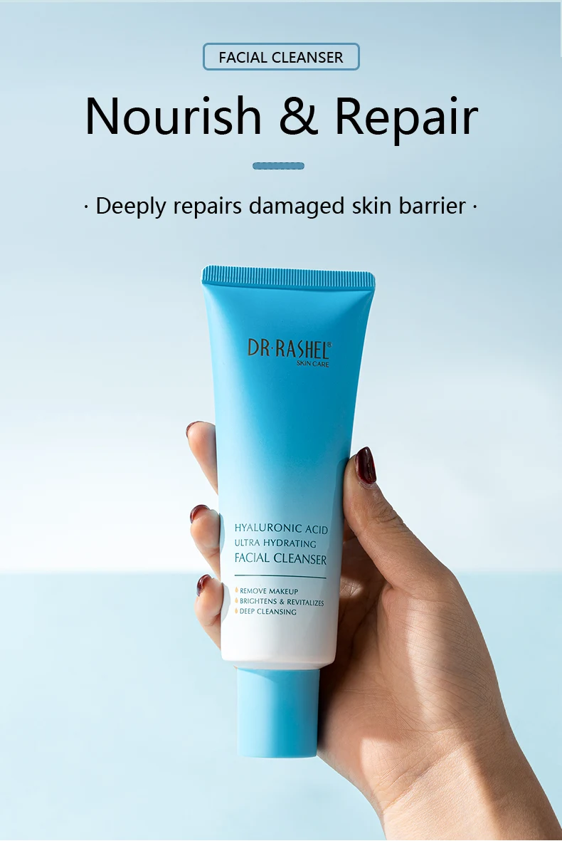 Dr. Rashel Hyaluronic Acid Ultra Hydrating Facial Cleanser removes dirt and oil and effectively dissolves waterproof makeup and sunscreen,leaving your face clean and soft.This gentle facial cleanser with ingredients like vitamin B5 and hyaluronic acid that work to restore the skin’s natural barrier to help the skin lock in moisture,skin looks fresh, hydrated, plump and youthfully radiant.