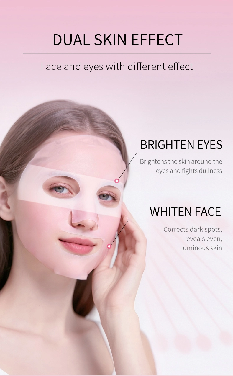 3. Remove the white fabric film, apply another two films onto the face (the middle gel mask attach to the face, white film is outside), then remove the white fabric film.