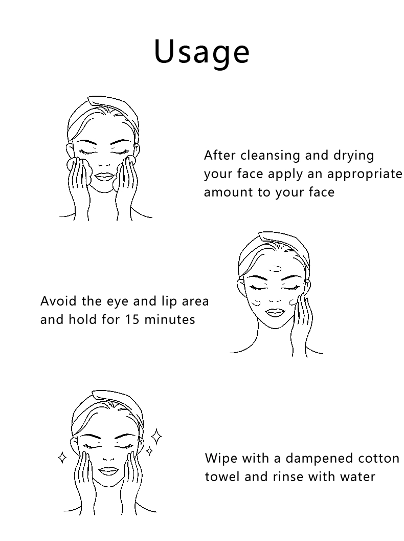 After cleansing, dry the face, apply an appropriate amount on the face, avoiding the eye and lip areas, keep it for 15 minutes, wipe it with a damp cotton towel, and then rinse with water.