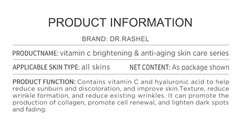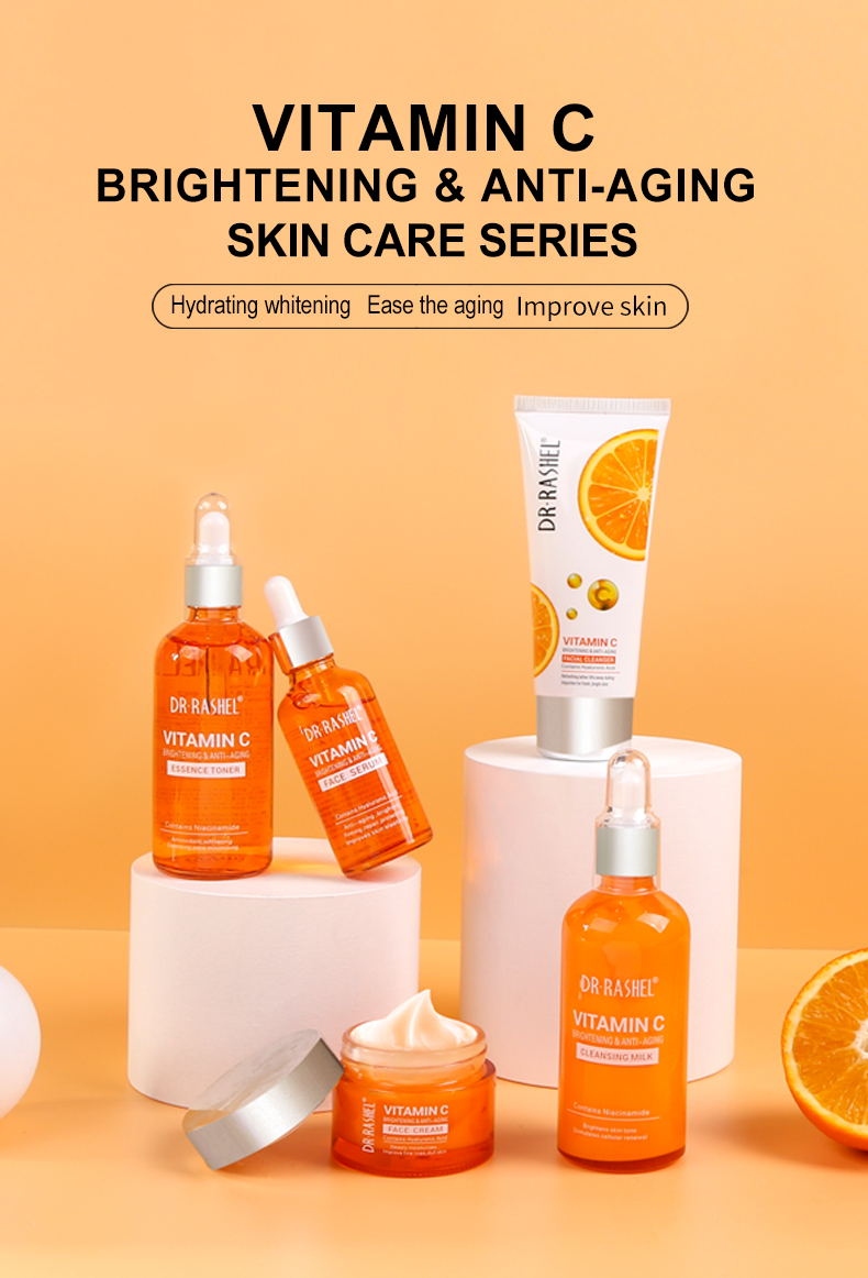 Vitamin C brightening & anti-aging facial cleanser removes dull impurities for clear, radiant skin. Vitamin C brightening & anti-aging face serum fights aging, brightens, firms, repairs, protects, and improves skin elasticity. Vitamin C brightening & anti-aging face cream deeply moisturizes and improves fine lines and dull skin. Vitamin C brightening & anti-aging essence toner protects your skin from harmful free radicals with antioxidants and can even help sun-damaged skin. Vitamin C brightening & anti-aging cleansing milk brightens your complexion and stimulates cell renewal.