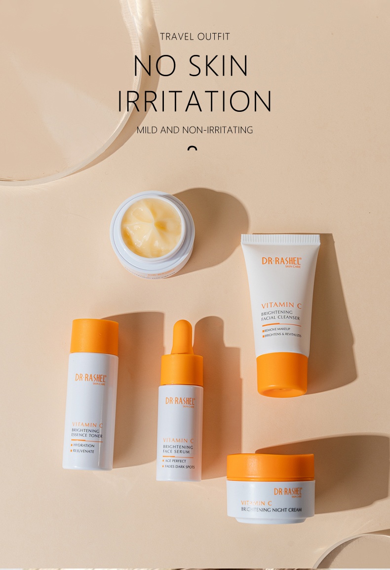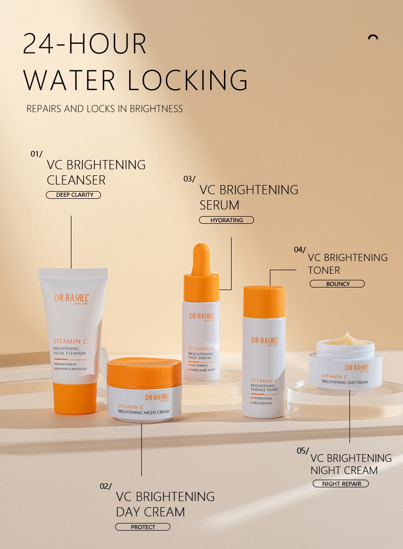 Vitamin C Brightening Facial Cleanser gently exfoliates and effectively cleanses the skin. Vitamin C Brightening Essence Toner tightens and cleanses pores from within, while helping to reduce the appearance of blemishes. Vitamin C Brightening Face Serum helps improve skin tone and enhance radiance. Vitamin C Brightening Day Cream improves skin elasticity, while Vitamin C Brightening Night Cream leaves your skin feeling moisturized and hydrated throughout the day.