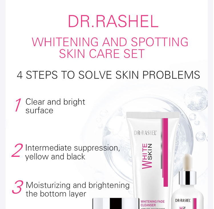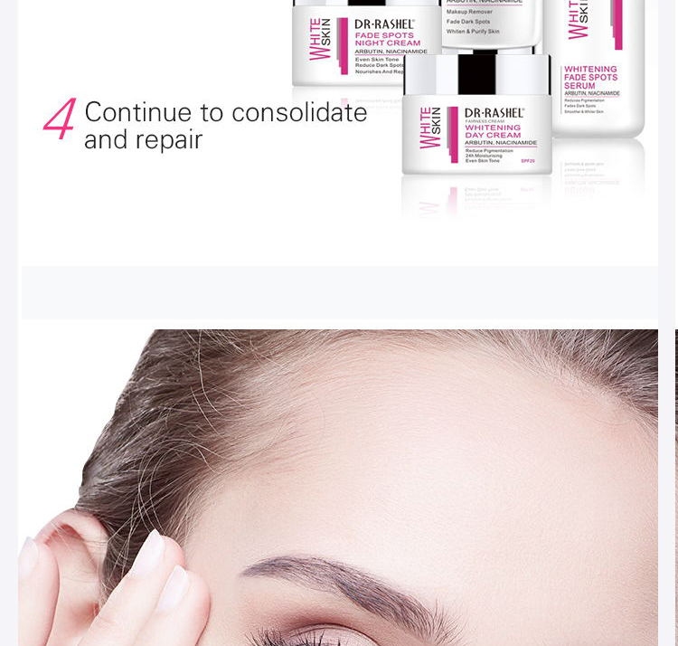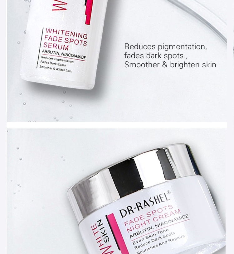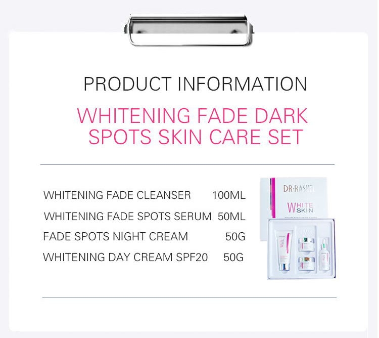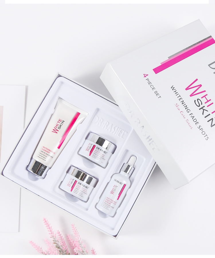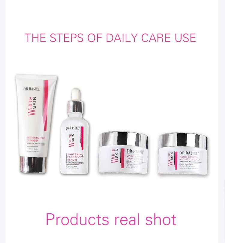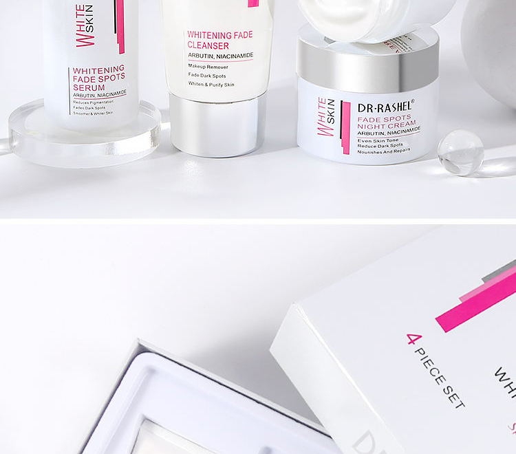 Whitening fade cleanser is a purifying face wash ,The creamy formula removes makeup, oil, dirt and debris from pores to promote healthy skin. Whitening fade spot serum brightens and clarifies skin for increased radiance.Fade spot night cream evens skin tone, reduces dark spots and discoloration for a brighter, more radiant complexion.Whitening Day cream provides instant brightening and a long-lasting, even-toned radiance, leaving skin looking refreshed all day long.In general, this set can achieve a good whitening effect on the skin and is an indispensable combination for people who pursue whitening.