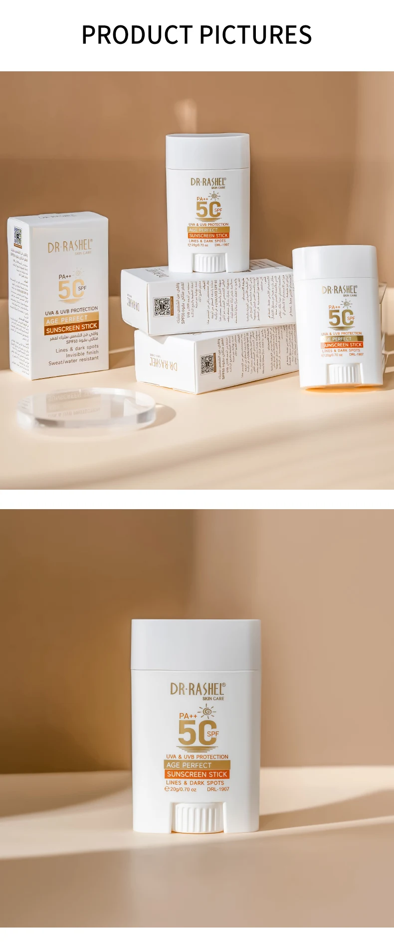 Dr. Rashel Age perfect sunscreen stick offers broad spectrum UVA/UVB SPF 50+ protection in an easy-to-carry and easy-to-apply formula. This non-tinted solid sunscreen glides on easily, rubs in clear and dries smooth, not sticky. Waterproof and sweat , making it an ideal choice for outdoor activities.