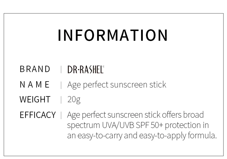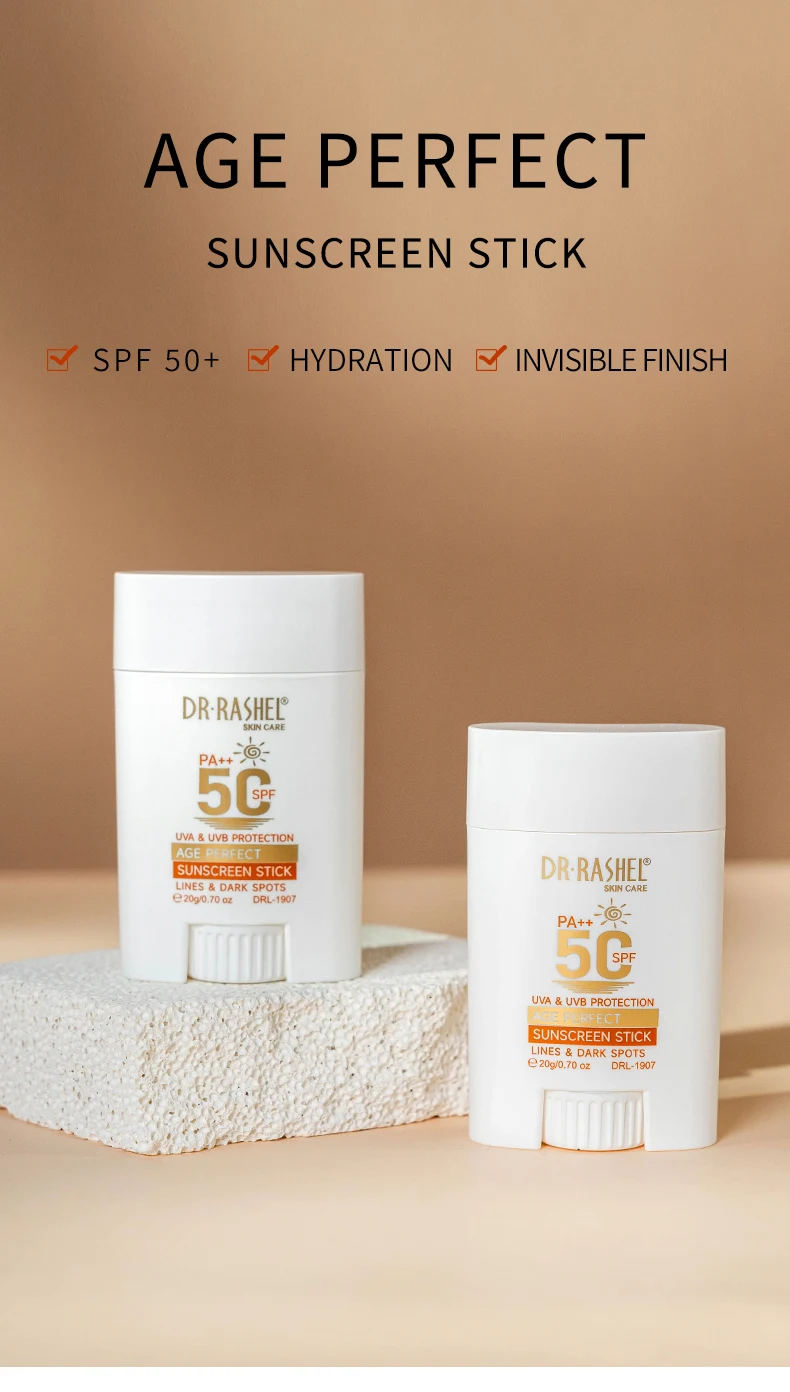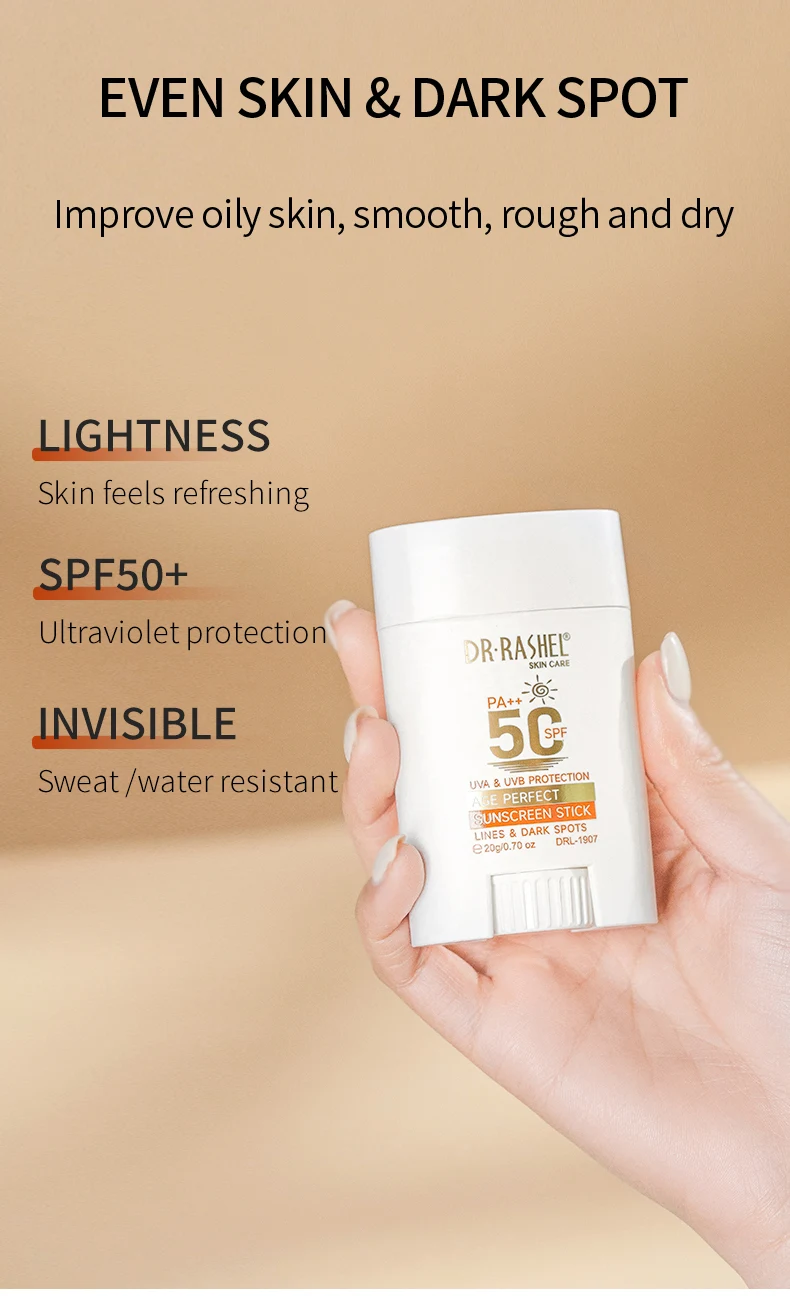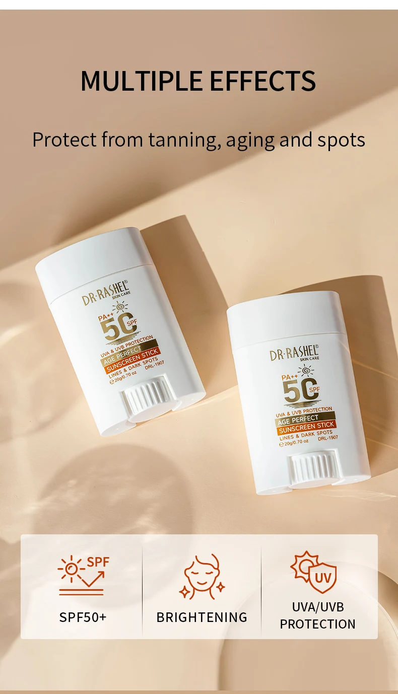 Dr. Rashel Age perfect sunscreen stick offers broad spectrum UVA/UVB SPF 50+ protection in an easy-to-carry and easy-to-apply formula. This non-tinted solid sunscreen glides on easily, rubs in clear and dries smooth, not sticky. Waterproof and sweat , making it an ideal choice for outdoor activities.