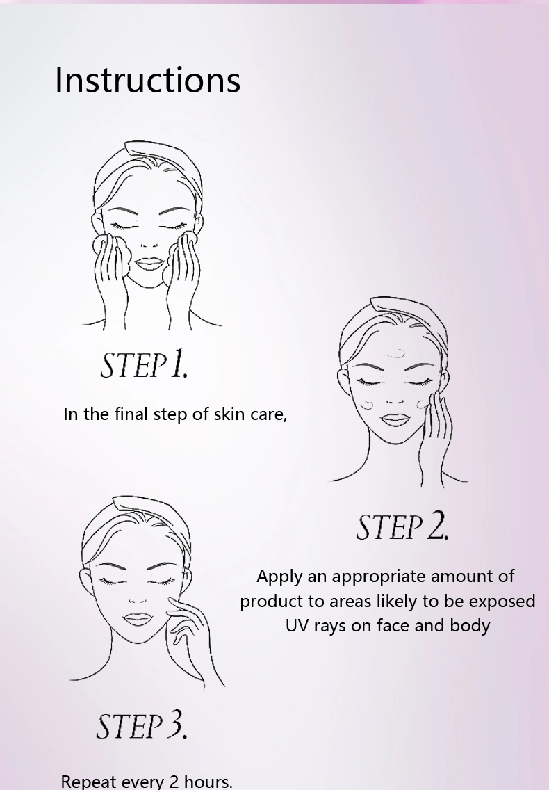 At the last step of skin care,spread appropriate amount of the product over the face and body that are likely to be exposed to ultraviolet rays. Repeat application every 2 hours.