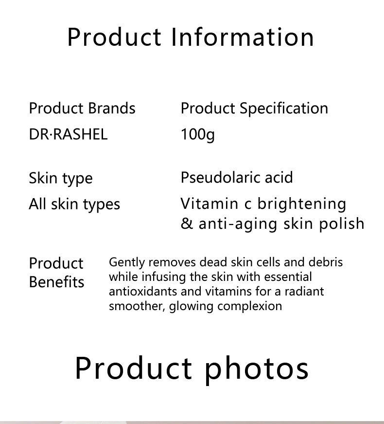 Dr. Rashel Vitamin c brightening & anti-aging skin polish gently sweeps away dead skin cells and debris while infusing skin with essential antioxidants and vitamins to reveal a luminous, smoother and more radiant complexion.Vitamin c extract to help brighten complexion and emollients to combat dryness. With regular use skin polish will refine pores and uncover skin’s youthful and glowing appearance, makes skin soft, supple and more youthful looking.