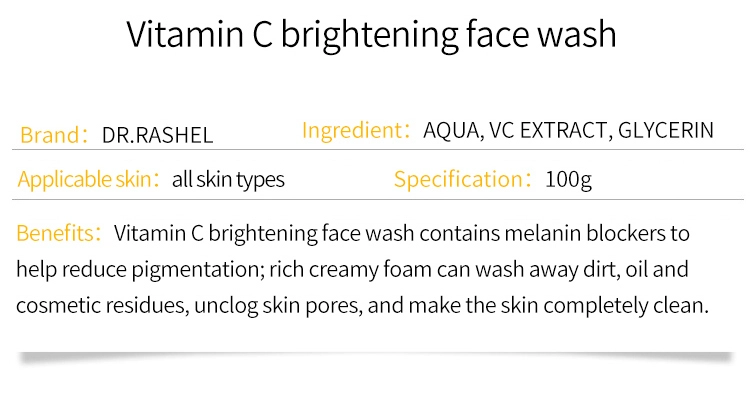 Dr. Rashel Vitamin C brightening face wash is an advanced skin-brightening and anti-aging cleanser.The formulation with melanin blockers helps lighten pigmentation, the rich cream foam can wash away dirt, oil and makeup residue, unclog the skin pores, and make the skin completely clean. And vitamin C a powerful antioxidant helps prevent skin damage by blocking the free radicals.