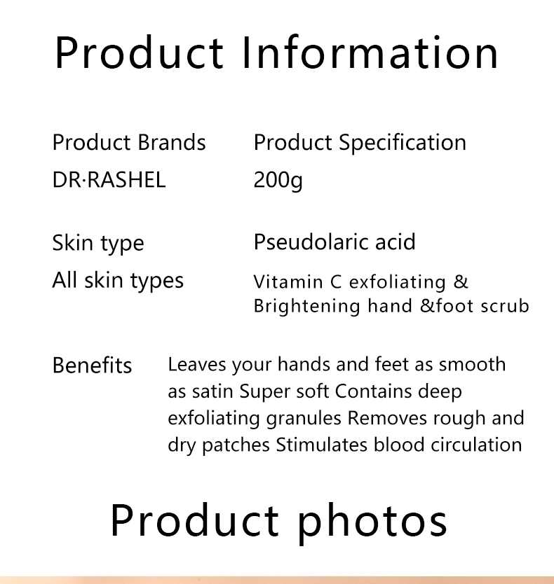 Dr. Rashel Vitamin C exfoliating & brightening hand &foot scrub Get the satin-smooth, super softer, beautiful hand and foot with vitamin C exfoliating & brightening hand &foot scrub. This amazing hands and feet scrub is designed with deep exfoliating granules which slough off the rough and dry patches, improvise the circulation of blood and make the hands & feet softer, radiant and glowing.Using a foot scrub at least twice a week helps to soften the skin and smooth away any calluses on your feet