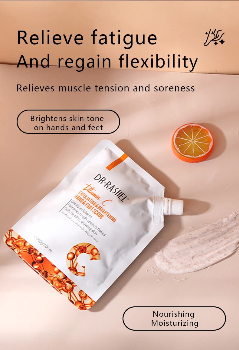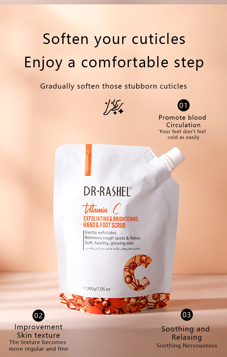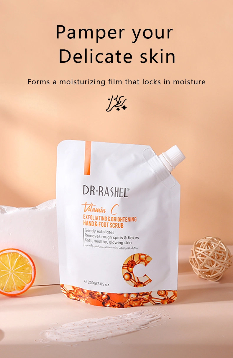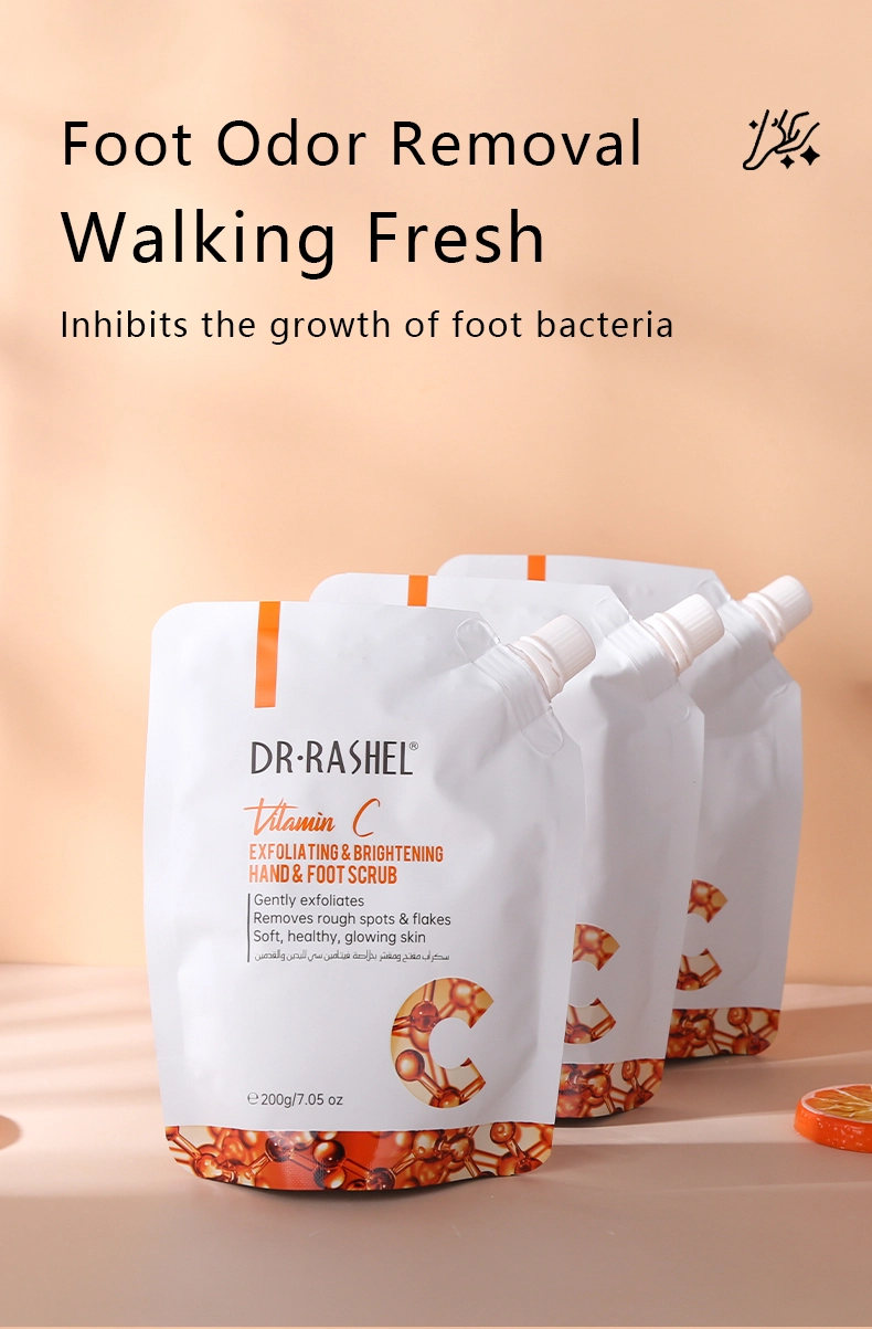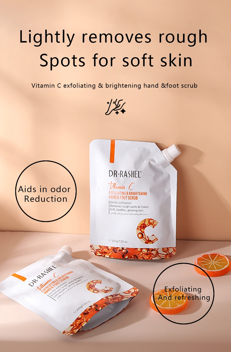 Dr. Rashel Vitamin C exfoliating & brightening hand &foot scrub Get the satin-smooth, super softer, beautiful hand and foot with vitamin C exfoliating & brightening hand &foot scrub. This amazing hands and feet scrub is designed with deep exfoliating granules which slough off the rough and dry patches, improvise the circulation of blood and make the hands & feet softer, radiant and glowing.Using a foot scrub at least twice a week helps to soften the skin and smooth away any calluses on your feet