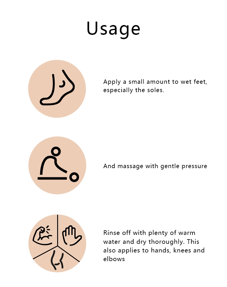 Apply a small amount to moist feet, especially the sole of feet, and massage in using gentle pressure. Rinse off with plenty of warm water and dry thoroughly.Also works on hands, knees, and elbows.