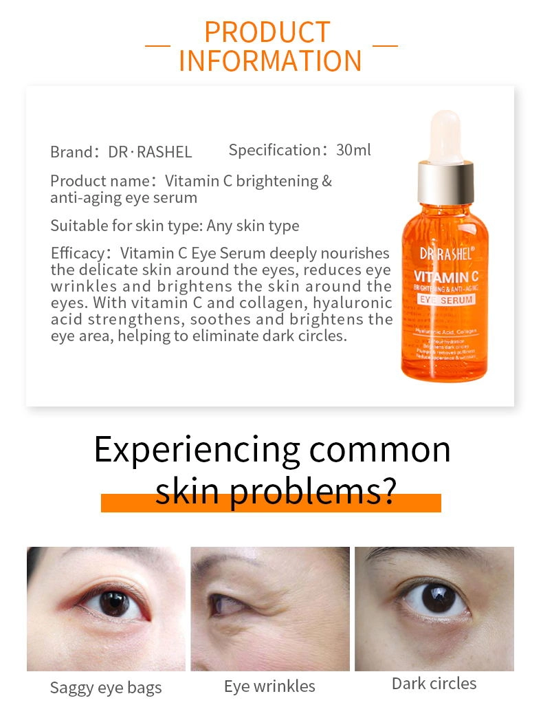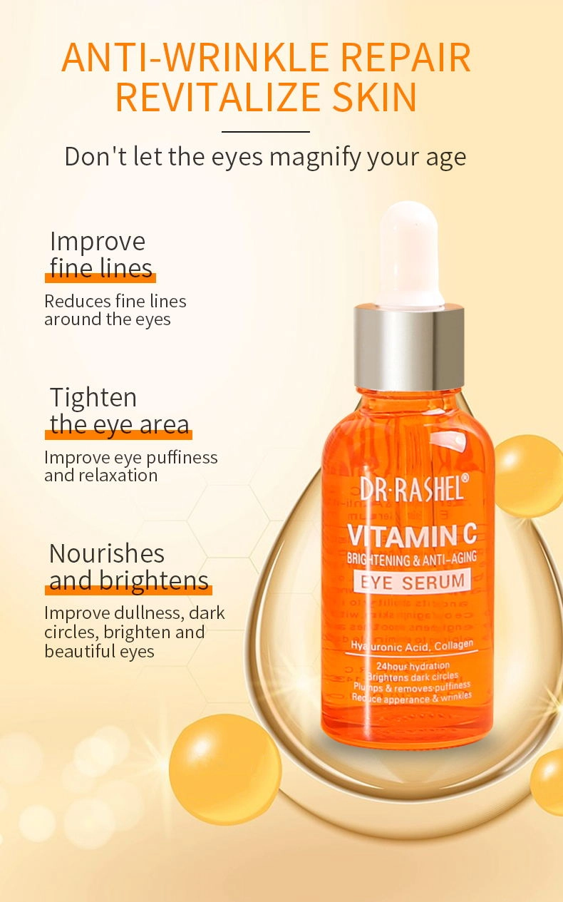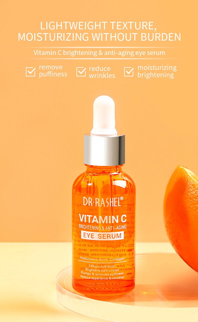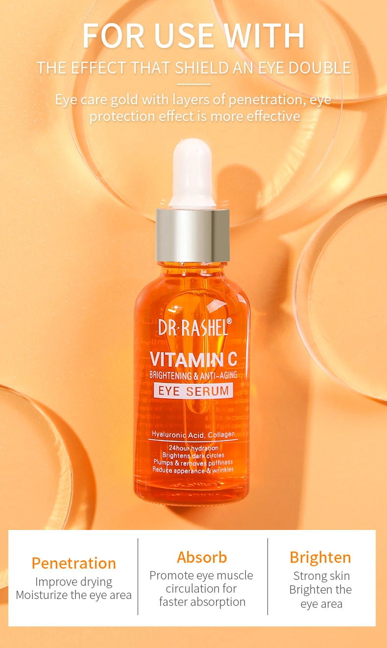 Dr. Rashel Vitamin c eye serum deeply nourishes the delicate skin around the eyes, reduces wrinkles on the eyes, and brightens the eyes. Contains pure vitamin C and collagen, known for its affinity with skin and its ability to improve the appearance of aging skin. With hyaluronic acid, it strengthens, soothes and brightens the eye, helping to eliminate dark circles.