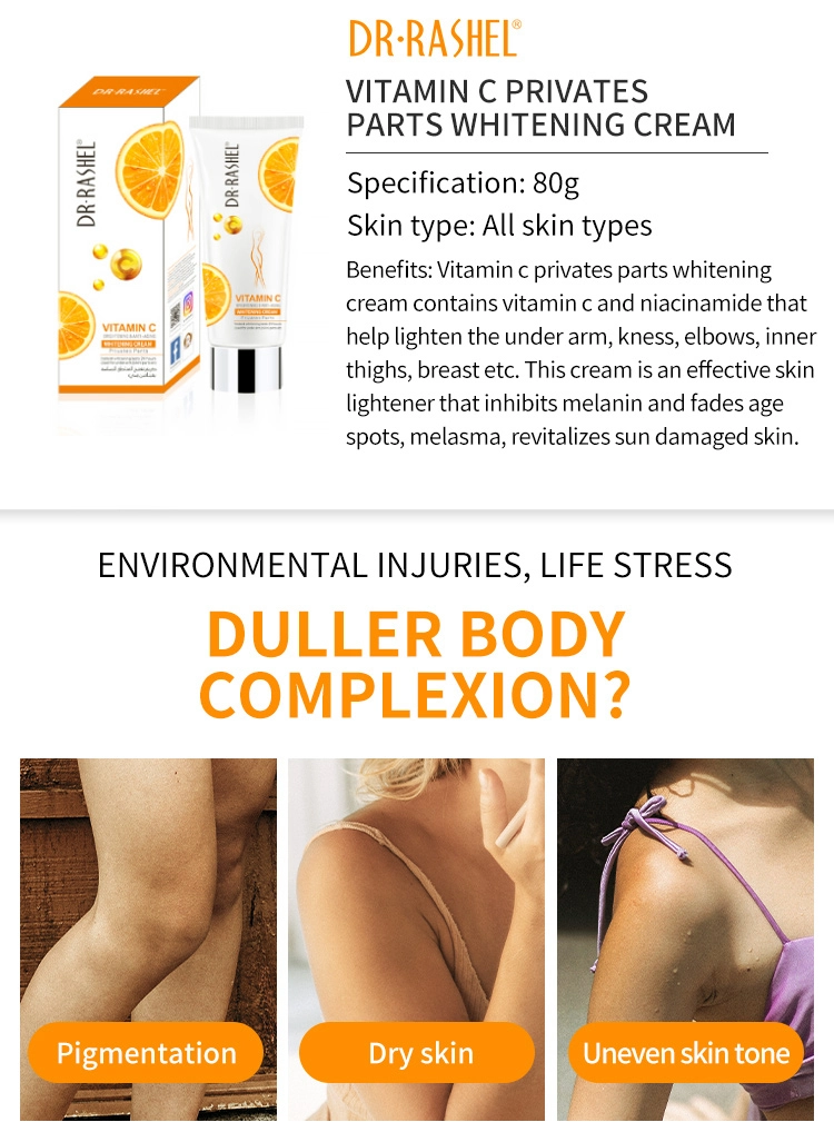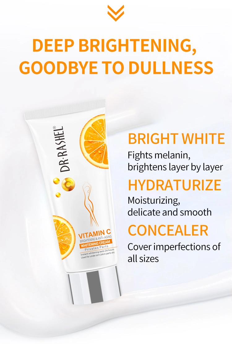 Dr. Rashel Vitamin c privates parts whitening cream contains vitamin c and niacinamide that help lighten the under arm, kness, elbows, inner thighs, breast etc. This cream is an effective skin lightener that inhibits melanin and fades age spots, melasma, revitalizes sun damaged skin. Gentle cream type, fast absorbing into skin, lightweight, and non-sticky which makes it whitening, smooth, and soft.
