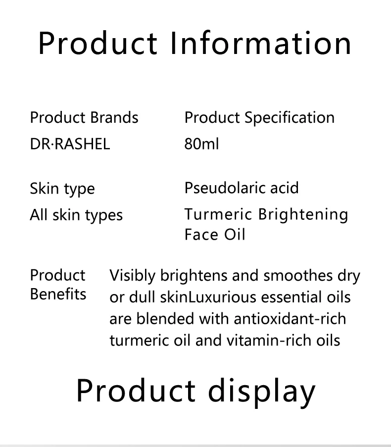 Description: A lightweight yet powerful face oil developed to visibly nourish, brighten and smooth dry or dull skin. This luxurious blend of antioxidant-packed turmeric and vitamin-rich oils work together to soften and strengthen the skin to support its natural radiance.