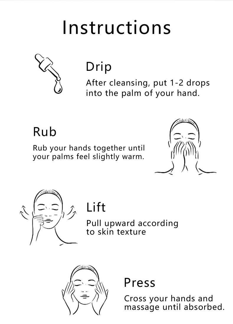 After cleansing, put 1-2 drops on the palm, rub your hands together until the palms are slightly warm, lift up and massage according to the skin texture until absorbed.