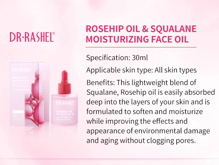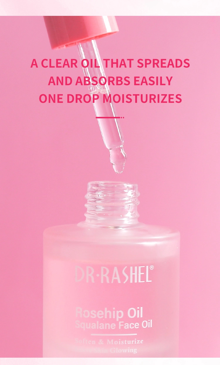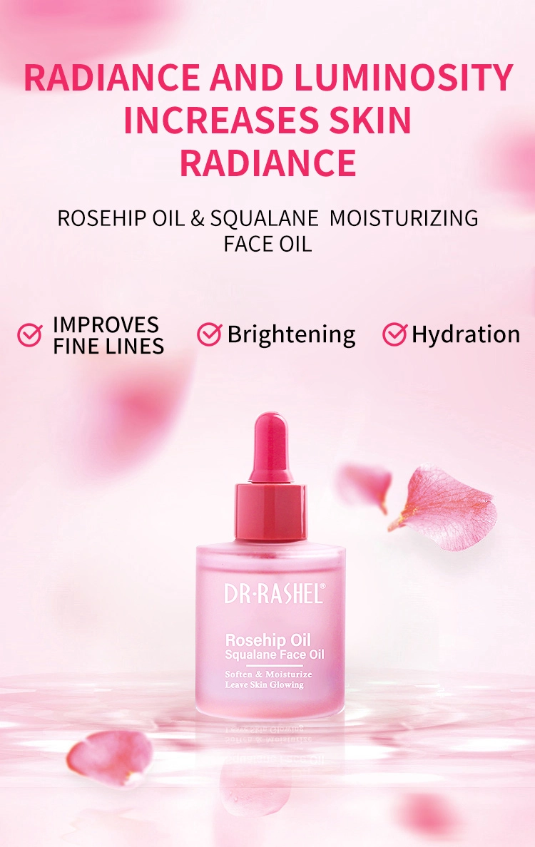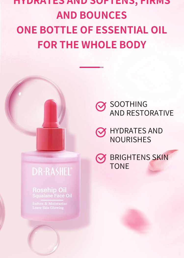 Dr. Rashel This lightweight blend of Squalane, Rosehip oil is easily absorbed deep into the layers of your skin and is formulated to soften and moisturize while improving the effects and appearance of environmental damage and aging without clogging pores. Roseship seed oil is a vitamin-rich luxurious oil that deeply moisturizes & brightens skin while evening out skin tone and renewing skin’s firmness.