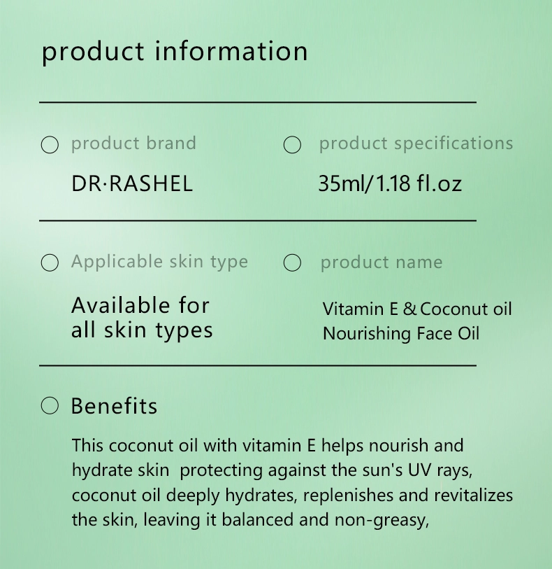 Dr. Rashel This organic coconut oil with vitamin E will help nourish and moisturize the skin, protect against the sun’s UV rays, improve fine lines and wrinkles.Coconut oil to deeply boost hydration, replenishing and revitalizing skin to its most naturally dewy, radiant and healthy-looking state. Helps maintain skin’s optimal moisture level so skin is balanced and never greasy or over producing oil to compensate for dryness.
